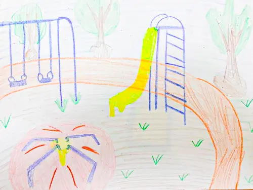 Моя работа выполнена цветными карандашами. На ней изображена детская площадка, на которой мы любим играть, в сквере Люблино. Этот сквер находится недалеко от моего дома.
