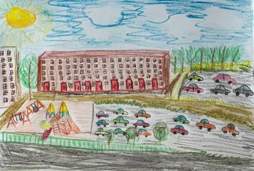 Моя работа выполнена цветными карандашами. Я решил нарисовать вид с птичьего полёта. В моём дворе красивые дома, детская площадка, есть отдельная стоянка для машин.