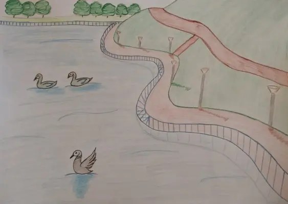 На моей работе пруд с утками в Дюссельдорском парке.Работа выполнена цветными карандашами. Этот парк находится через дорогу от моего дома.Я часто там гуляю.
