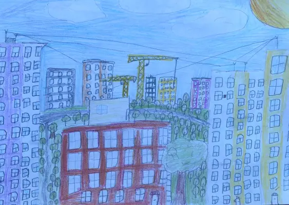 Мой район большой и красивый. У нас много новых домов. Эти дома все высокие и цветные. Несмотря на это, с помощью подъёмных кранов строятся еще дома. Моя работа выполнена цветными карандашами.
