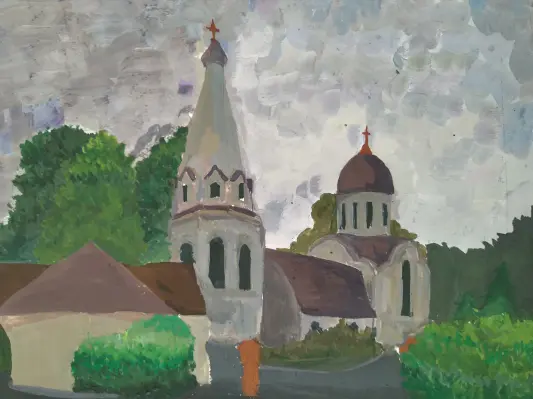 Работа была сделана в июне 2024 года во время пленэра в Троицкой ДХШ, мы с ребятами ходили рисовать храм Тихвинский иконы Богоматери. День был пасмурный, начинал накрапывать дождь, поэтому и в этюде передано такое состояние природы.