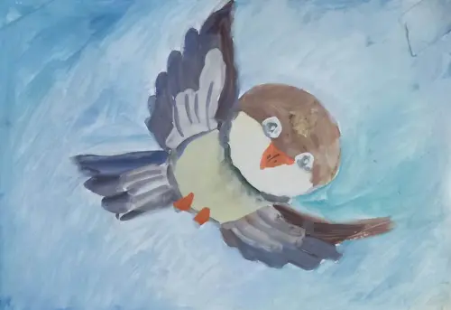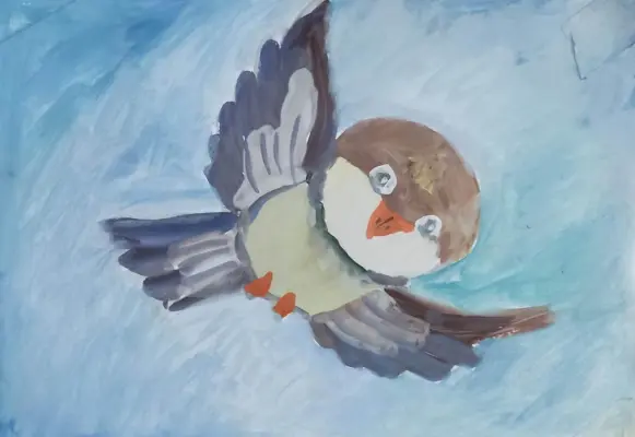 Это мой пернатый друг. Мы познакомились с ним во дворе, когда он купался в луже. Было очень забавно за ним наблюдать. Я назвал его Чистюля и сходил за пшеном для него. Но когда я вернулся, он уже улетел.