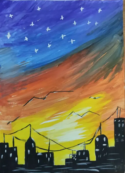 Когда наступает ночь, то в нашем районе на небе видны звезды. Высотные дома, стоят как великаны, черные с различными антеннами на крыше, а небо сказочно красивое.