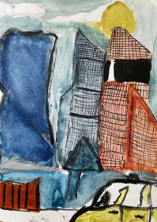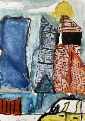 Работа написана на пленэре. На ней изображены башни Эволюция, Меркурий и другие.Работа написана на пленэре. На ней изображены башни Эволюция, Меркурий и другие. На переднем фоне — фрагмент Экспоцентра. Работа написана на пленэре. На ней изображены башни Эволюция, Меркурий и другие. На переднем фоне — фрагмент Экспоцентра, а также не по правилам припаркованное такси:)