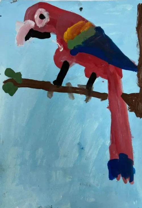 Попугай живет у соседей, напротив моего дома. Иногда он улетает от них, и садится на ветку дерева, которое растет рядом с моим домом. Попугай очень красивый!