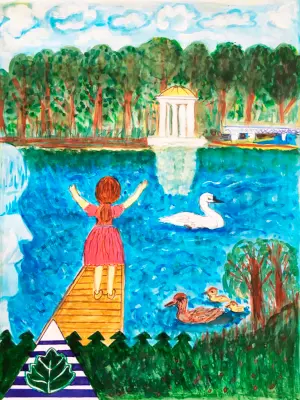 В небольшом наукограде Троицк, есть прекрасный живописный уголок Заречье. Любимое место отдыха для жителей города. Там можно полюбоваться на лебедей и уток, можно взять в прокат лодку и поплавать по реке Десна. В работе мы изобразили излюбленное место всех отдыхающих беседку в стиле Ротонда.