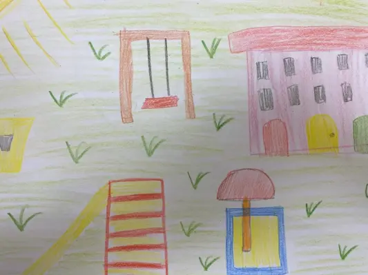 Моя работа выполнена цветными карандашами. На ней мой самый лучший двор. У меня есть во дворе качели, песочница для малышей, горка.Летом много цветов красивых растет.