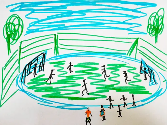 Я очень люблю играть в футбол, на площадке в своем дворе с друзьями.Я очень люблю играть в футбол, на площадке в своем дворе с друзьями. Папа тоже часто к нам присоединяется. Я очень рад, что сейчас лето и каникулы и есть больше времени заниматься любимым спортом.