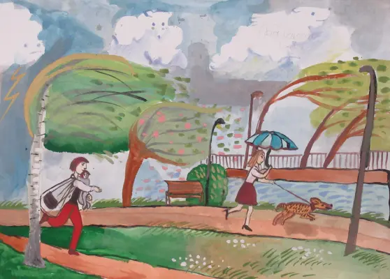 Я нарисовала грозу в городе. Когда гремит гром, меня это пугает, но когда сверкает молния, выглядит очень красиво! Люблю наблюдать из окна моего дома за природными явлениями.