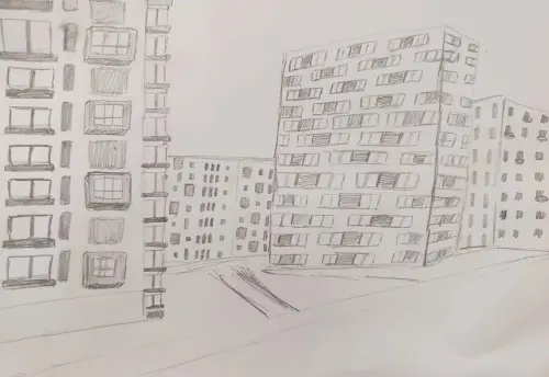 Моя работа выполнена графическим карандашом. Я постаралась изобразить большое количество наших домов. Не смотря, что район старенький сейчас он облагорожен и красив.