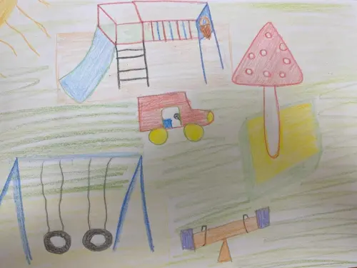 Моя работа выполнена цветными карандашами. Я нарисовал двор, в котором гуляю. У нас на детской площадке есть классные качели, машинка, горка. Я люблю свой двор.