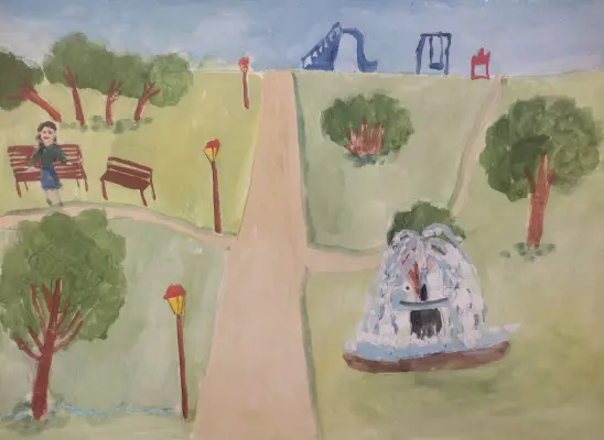 Павел нарисовал Измайловский парк, дорожку, фонтан и детскую площадку. Летний тёплый день, парк ухожен и красив. Работа выполнена гуашью. Павел в работе учитывал законы перспективы: дальние объекты сделал меньше ближних.