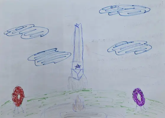 Сегодня нам с ребятами предложили нарисовать одно из мест нашего прекрасного города. Я вспомнила как гуляла с родителями рядом с памятником "Штыки". Мне очень понравилось.