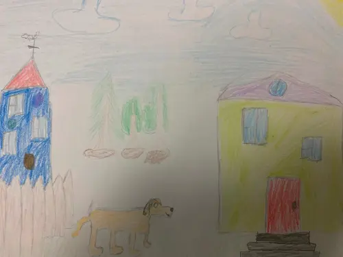 Я выполнила свою работу цветными карандашами.На ней я нарисовала свой дом. За домом есть площадка, где выгуливают собак. У нас очень много деревьев и зелени, цветов.Я выполнила свою работу цветными карандашами.На ней я нарисовала свой дом. За домом есть площадка, где выгуливают собак. У нас очень много деревьев и зелени, цветов.