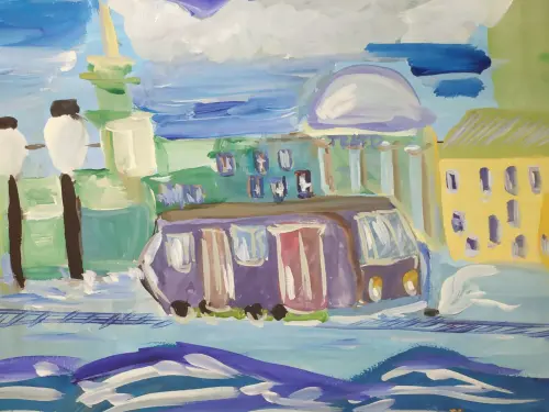 Я люблю наблюдать за неспешными трамваями у Чистых прудов. Гуляешь по бульвару-слева пруд с уточками, а справа гуляют люди, стоят вековые дома с яркими фасадами и едут трамваи. Так хорошо, что такая красота есть в моем районе и я с детства могу гулять тут. Когда я стану взрослой, я буду приезжать к пруду и трамваям и вспоминать себя маленькой, как стою и смотрю на проезжающие трамваи. И все в воспоминаниях будет как на моем рисунке-солнечный день, голубое небо, красивые дома, пруд и трамвай.