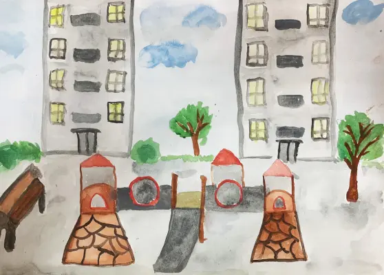 Я нарисовал свою любимую площадку. Она находится на Сиреневом бульваре. Я часто встречаюсь там с друзьями. Площадка похожа на старый замок. Мы с ребятами представляем себя рыцарями, берем игрушечные мечи и устраиваем сражения.