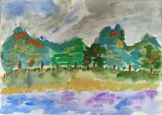 В нашем районе есть замечательный сквер. В нем есть скамейки и лежаки для пассивного отдыха и воркаут-зона для любителей спорта, также есть большая детская зона и много зеленых насаждений, что особенно ценно в жаркую погоду. На картине изображен вид со стороны водоема