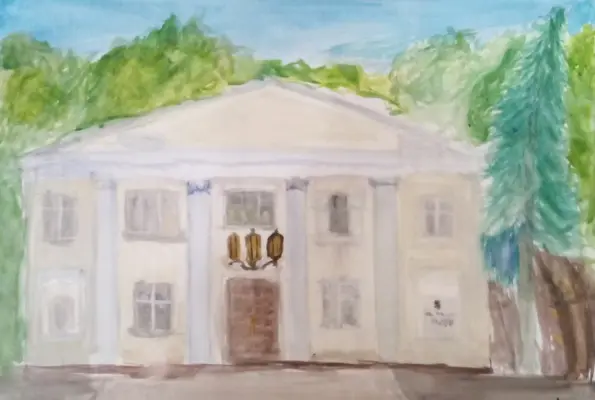 Работа написана около фонтанаРабота написана около фонтана в Измайловском парке, исполнена гуашьюРабота написана около фонтана в Измайловском парке, исполнена гуашью. Изображено здание на фоне деревьев паркаРабота написана около фонтана в Измайловском парке, исполнена гуашью. Изображено здание на фоне деревьев парка. Здание на площади с фонтанами было построено в 1950-е годы для кинолектория (по другой версии – для кинотеатра «Лето»), который со временем закрылся и после ремонта в нём разместилась Дирекция Измайловского парка.