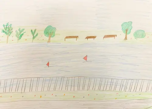 Моя работа выполнена цветными карандашами. Я нарисовала набережную в нашем парке «Печатники». Я там часто гуляю с родителями. Там же есть и порт. Можно сесть на речной трамвайчик и покататься по реке Москве.