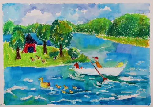 Парк Ангарские пруды. Работа выполнена в смешанной технике масляная пастель и акварель, на формате бумаги А3. Занятия проходят на базе ГБОУ ДО ЦРТДЮ "Гермес", на улице Учинская дом 10, изостудия "Образ", педагог Лыкова Н.В.