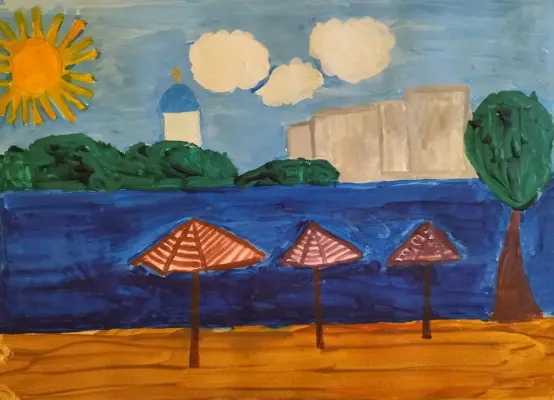 На своем рисунке я изобразила наше любимое место отдыха в районе Орехово-Борисово Северное. Это Борисовские пруды, пляжная зона с зонтиками и храм Живоначальной Троицы. Летом мы отдыхаем на берегу, а зимой здесь катаемся с горки.