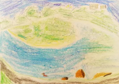 Работа выполнена в технике восковые мелки, в рамках интерактивной летней программы «Лето на планете «Гермес», под руководством педагога по рисованию Костиной Е.В.