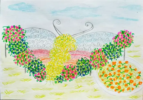 Наша любимая клумба в районе — в форме бабочки. Здесь можно найти разнообразные оттенки розового, красного, жёлтого и фиолетового, которые переплетаются с зеленью листьев и стеблей.