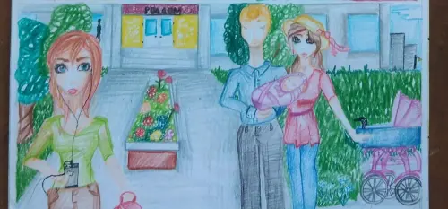 На рисунке изображен мой дом и двор. Двор небольшой, но очень уютный. Я выхожу во двор и вижу гуляют соседи с малышом. Скоро малыш будет бегать и нам будет весело.