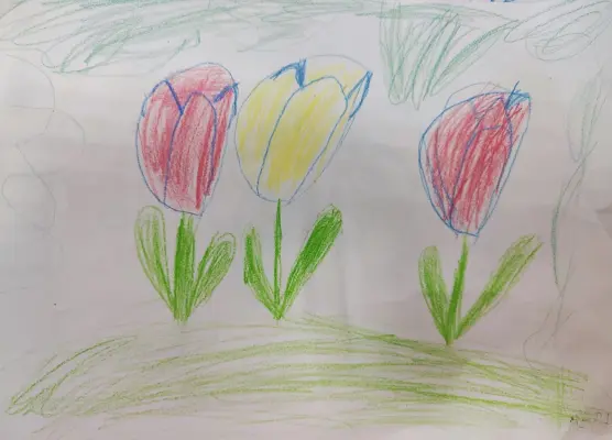 Очень люблю цветы. В мае в районе очень много тюльпанов, красивых и милых. Поэтому я решила нарисовать их.