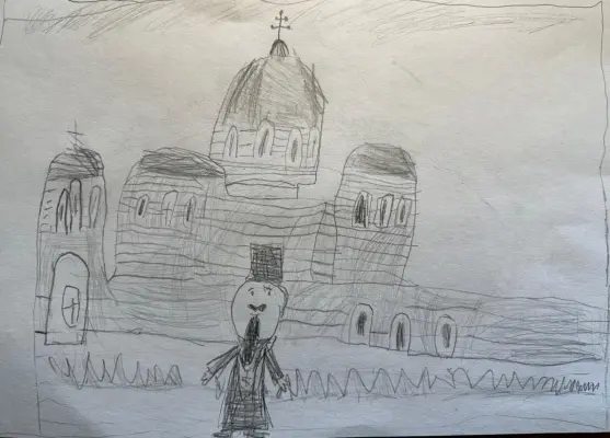 Я нарисовал храм, который был построен в честь священномученика Ермогена и батюшку, который служит в этом храме и которого я очень люблю. Мы с моими братьями и сестрой часто бываем там.
