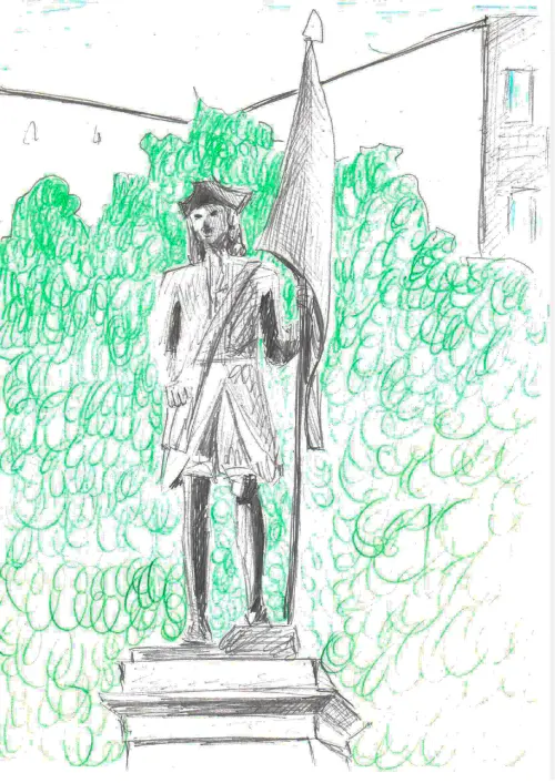 Я нарисовал памятник Бухвостову, потому что он является достопримечательностью нашего Преображенского района. Бухвостов Сергей Леонидович участвовал практически во всех военных кампаниях Петра 1.