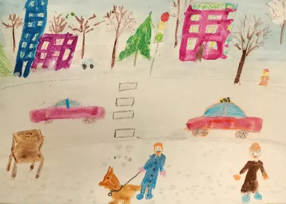 Каждый день я вижу как гуляют с большой рыжей собакой. Она никогда не лает, не боится машин. Спокойно за хозяином переходит улицу и уходит за красный дом. Мне нравится жить в моём новом доме и смотреть на широкую светлую улицу.