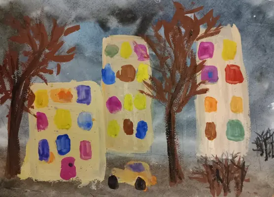 Когда мы гуляем вечером, то очень интересно смотреть на окна нашего дома. Они такие разноцветные, яркие. А на фоне темного неба, кажутся ещё ярче и красивее.