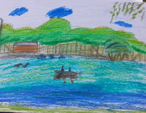 Свою работу я нарисовал в Терлецком парке на занятиях в изостудии. Мы любим выходить на пленэры и изучать природу. Я хотел передать в своей работе летний день и красивый цвет воды.