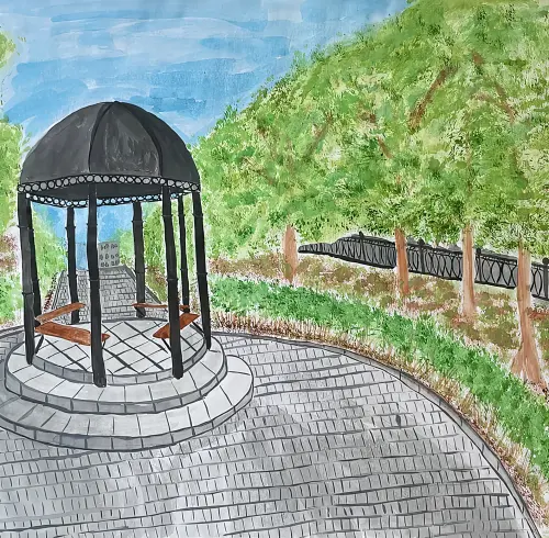Я нарисовала свою любимую беседку, которая находится на аллее, Кунцевской улице. В моем районе очень много раз снимали и снимают фильмы. На этой аллее в 1989 году на Кунцевской улице снимали фильм «Система «Ниппель». В процессе съёмок были задействованы танки. В картине они используются для «штурма» Дома культуры», которого к сожалению уже нет. Да и наша аллея немного преобразилась. Все жители близь стоящих домов очень любят прогуливаться по аллее, заниматься спортивным бегом, прогуливаться со своим питомцем, посидеть на лавочках и беседках. По вечерам в хорошую погоду можно услышать как играют на гармони и гитаре. Я очень люблю свою аллею и беседку, которую я попыталась нарисовать.