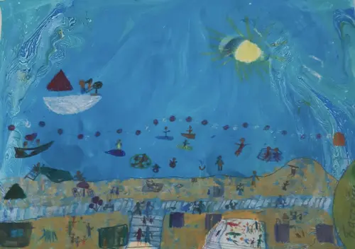 Работа выполнена гуашью. Я нарисовала пляж Динамо. Мы с моей большой семьей с огромным удовольствием побывали на пляже Динамо, так очень красиво, весело и можно купаться.