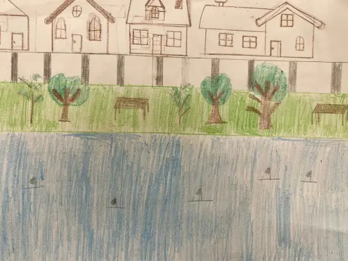 Я живу в районе Печатники недалеко от набережной. Москву-реку видно из моего окна. Я почти каждый день гуляю по набережной в парке. Нарисовал я рисунок цветными карандашами.