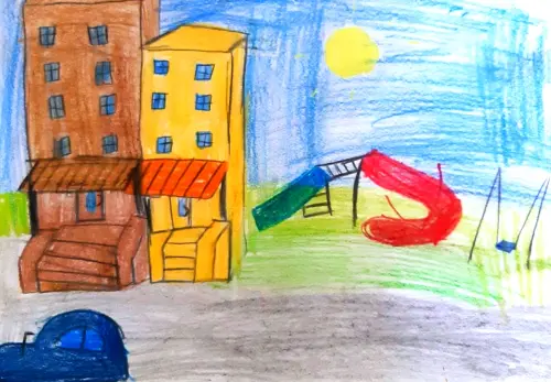 Работа выполнена гуашью. Я нарисовал нашу площадку во дворе. Мы любим там отдыхать после школы и сада, любим кататься на качелях, горках. Там много деревьев, и в жару можно отдохнуть в тени.