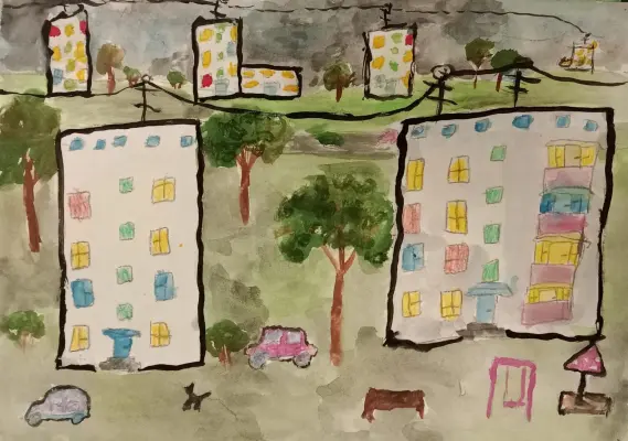 Я живу в высоком доме, на последнем этаже. Мне интересно смотреть в окно. Людей и машины я вижу очень маленькими. Даже высокие деревья около дома из моего окна кажутся меньше.