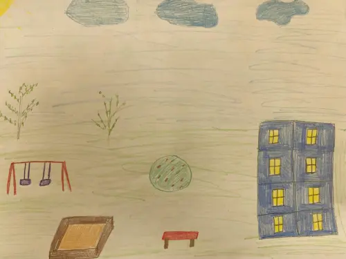 Я выполнил работу цветными карандашами. На работе изображен мой до и двор.Мы с ребятами очень любим играть в нем: качаться на качелях, играть в футбол.