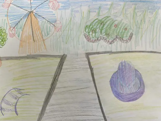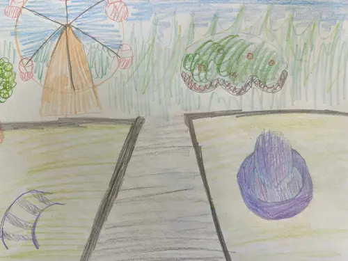 Я люблю проводить время с семьёй в парке аттракционов. Мой любимый аттракцион — колесо обозрения. Когда я на нем катаюсь, весь город как на ладони. Поэтому я изобразил парк в своем рисунке цветными карандашами.