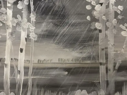 На рисунке изображен пруд, его зеркальная поверхность отражает небо, сливаясь с ним в единое пространство. Березы, символ России и чистоты. Их тонкие стволы словно танцуют на ветру, создавая ритмичный узор. В черно-белом исполнении парк кажется спокойным и загадочным.
