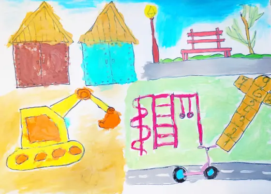 На этом рисунке изображено, как в нашем районе Ховрино, на месте старых и невзрачных гаражей появляются новые и современные общественные пространства.