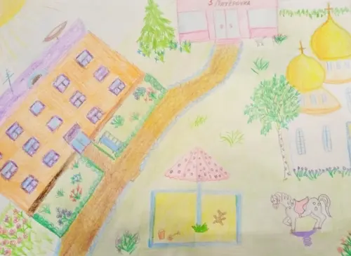 Я нарисовала двор, в котором живу, он мне очень нравится. Здесь я гуляю с мамой и папой. Играю в песочнице, качаюсь на лошадке. Двор находится рядом с моим домом. В моем дворе живут очень много моих друзей. Я очень горжусь своим двором.