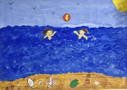 Мы всей семьёй ездили на море отдыхать. Отпуск был долгожданным. Этот отпуск мне запомнился тем, что мы с моей младшей сестрой много играли в море мячом. Именно эту картинку я запечатлила глазами и решила нарисовать.
