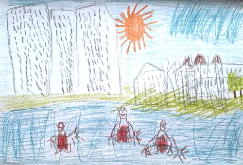 Я живу совсем рядом с Москва-реки. На другом берегу Парк культуры. Нарисовал про то, как бы я с друзьями летом купался в реке!!!