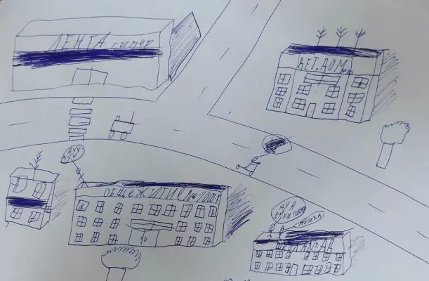На моем рисунке нарисовано: большой магазин Лента. Школа, есть ещё детский дом, где живут дети без родителей. Дорога, по которой ездят машины, общежитие.