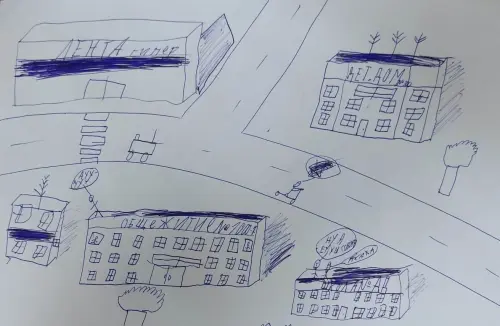На моем рисунке нарисовано: большой магазин Лента. Школа, Есть ещё детский дом где живут дети без родителей. Дорога по которой ездят машины, общежитие.