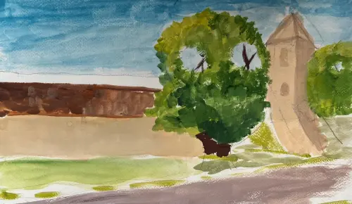 Однажды мы гуляли в Донском сквере и решили зайти в Донской монастырь, который основан 1591 году. Я люблю рисовать красивые здания, люблю посещать интересные места в Москве. На рисунке я изобразил колокольню с окружающим её небольшим садом.