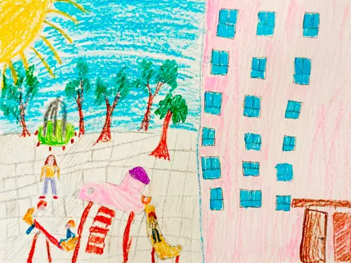 Меня зовут Полина. Я нарисовала двор на улице Пилюгина. Там современная детская площадка и много моих друзей. Когда погода хорошая, мы много времени проводим вместе.